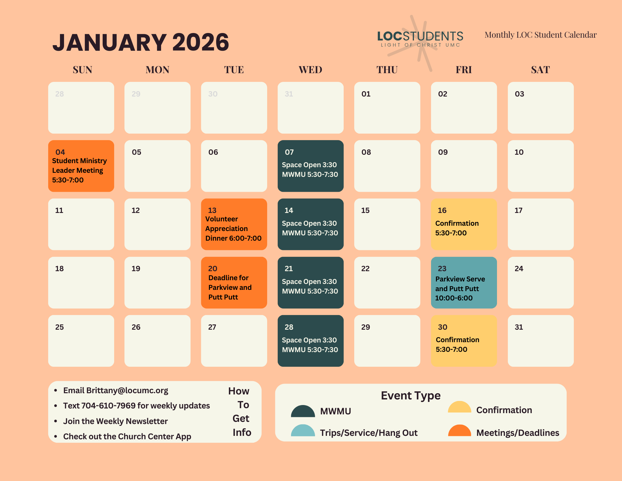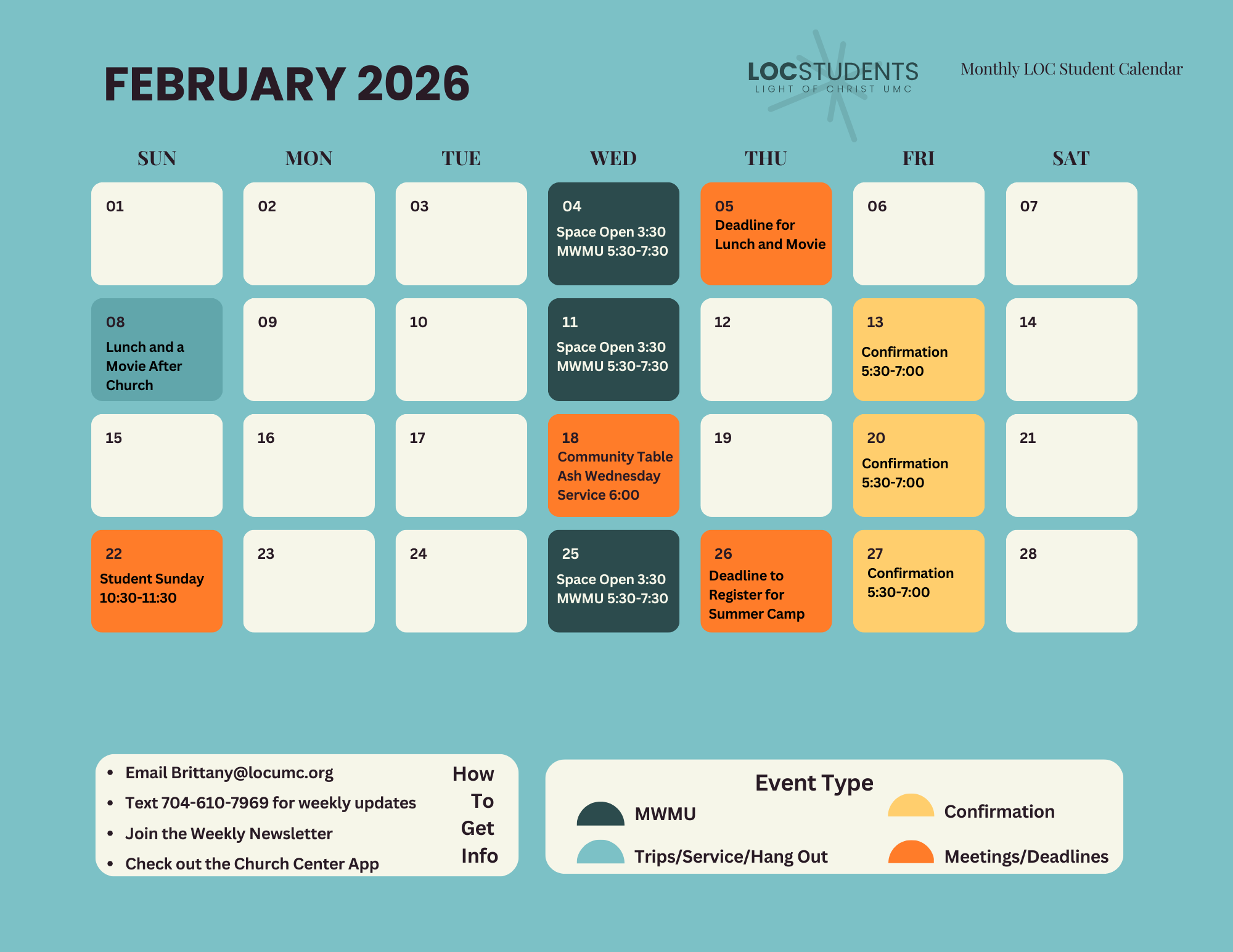 For more information or to receive our weekly newsletter contact our Interim Director of Student Ministries Brittany Bethel at brittany@locumc.org